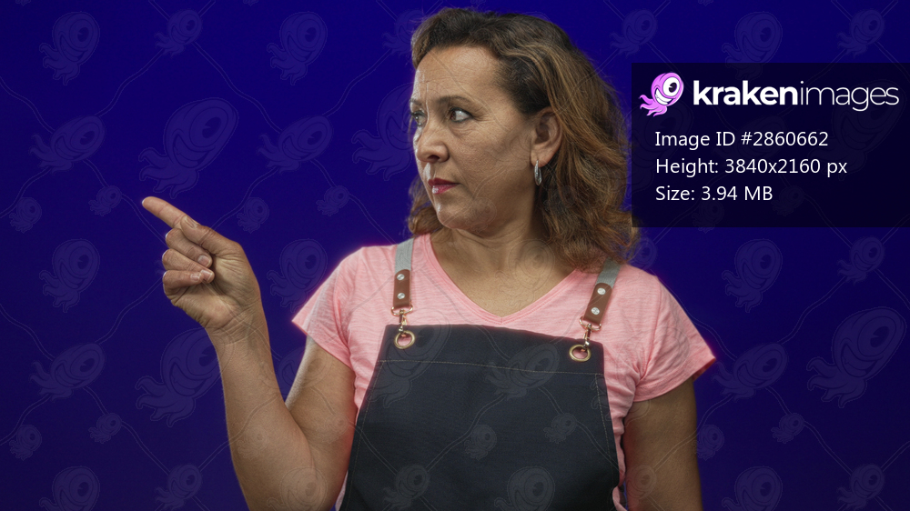 Woman in pink shirt points finger at unseen target in studio with deep blue backdrop; guidance and focus.