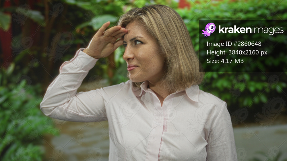 Woman in pink shirt shades eyes with hand in green park while gazing into distance; anticipation exploration.