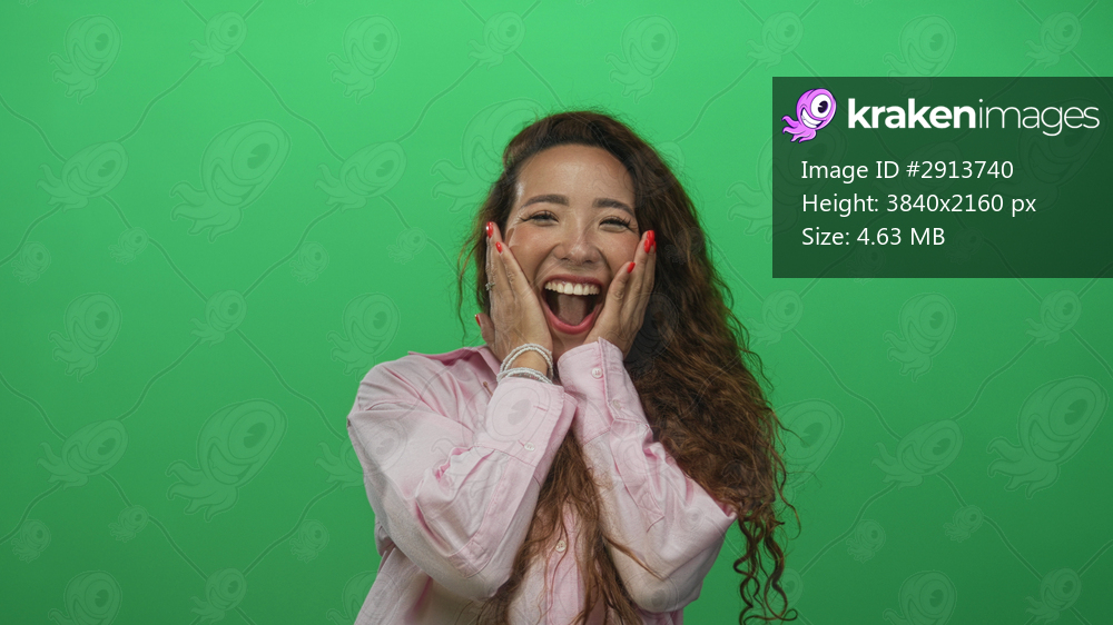 Woman in pink shirt smiling with hands on cheeks and open mouth laughing in green studio; surprise joy warmth.