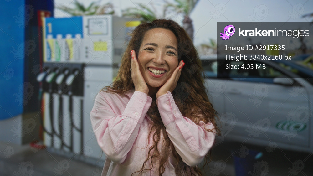 Woman in pink shirt smiling with hands pressed in prayer gesture by petrol station pumps next to a parked car on street; gratitude travel.