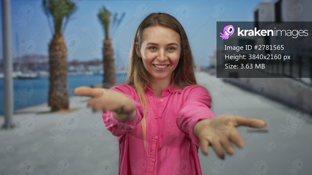 Woman in pink shirt smiling on a sunny beach promenade with palm trees and water in the background, experiencing joy and relaxation at a seaside location. - Kraken Images