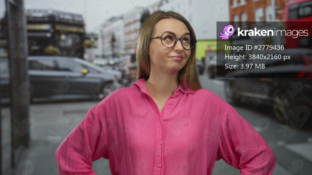 Woman in pink shirt standing on city street with a playful expression surrounded by cars and urban backdrop in a lively outdoor setting.