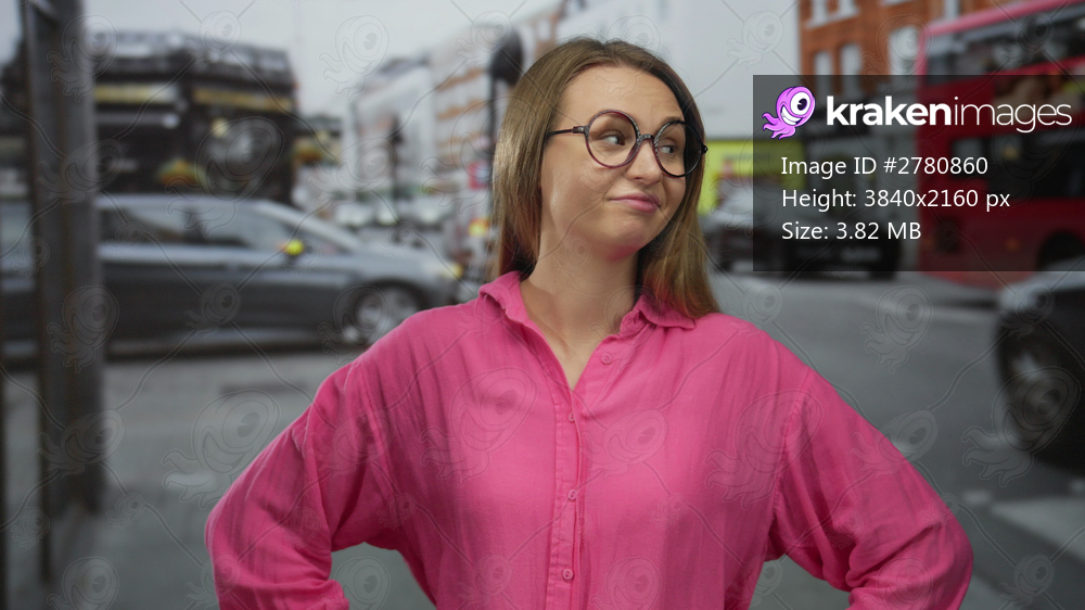 Woman in pink shirt standing on city street with a playful expression surrounded by cars and urban backdrop in a lively outdoor setting.