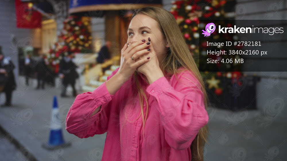 Woman in pink shirt standing on festive city street with decorations in background covering her mouth playfully.