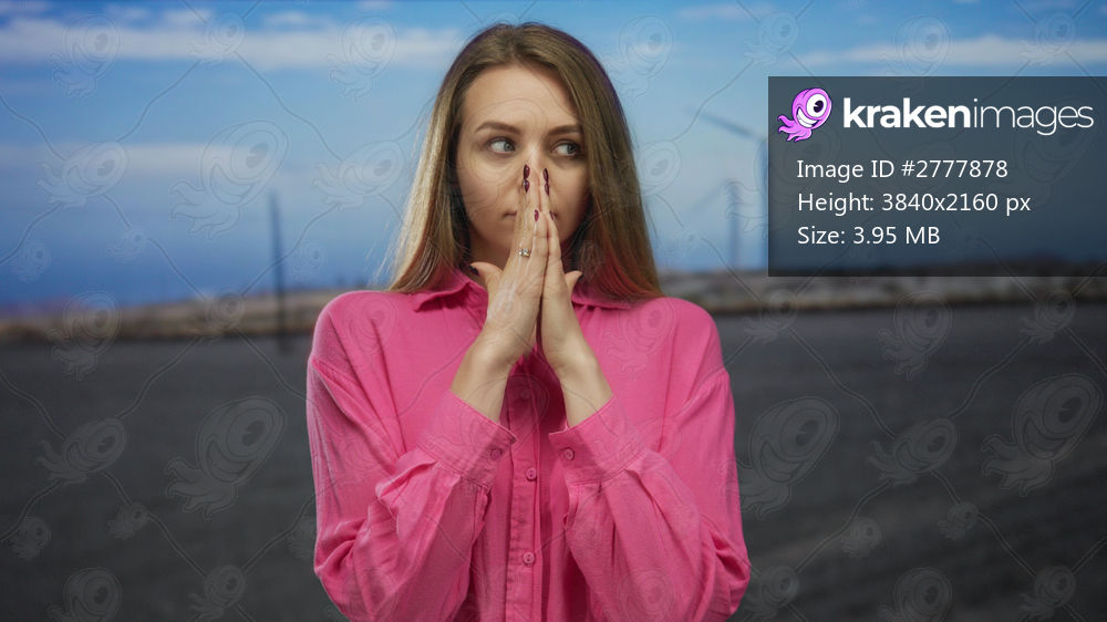 Woman in pink shirt standing outdoors with hands clasped in prayer, against a backdrop of windmills in a vast, serene field under a clear blue sky.