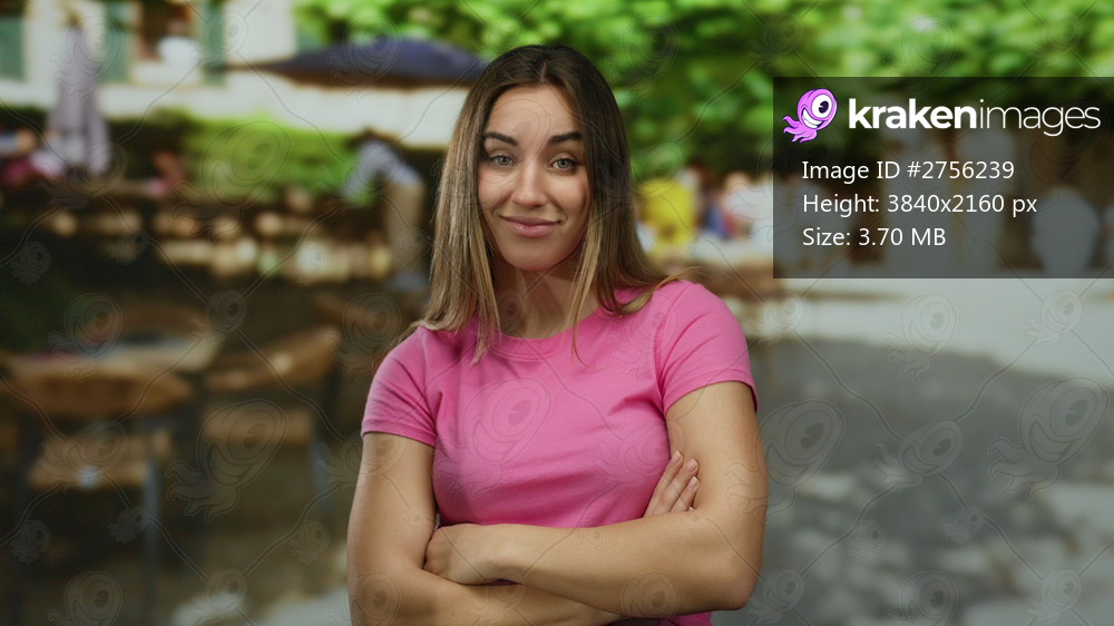 Woman in pink shirt stands confidently with arms crossed on a sunny street background suggesting urban outdoor lifestyle and young attitude.