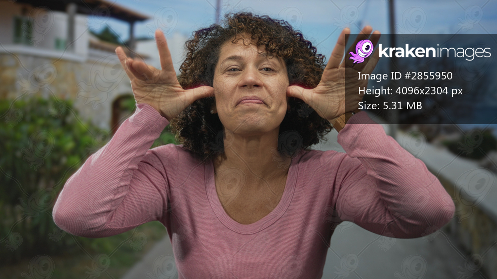 Woman in pink shirt sticks tongue out under bright sunlight with crossed arms on street; playful mischief.