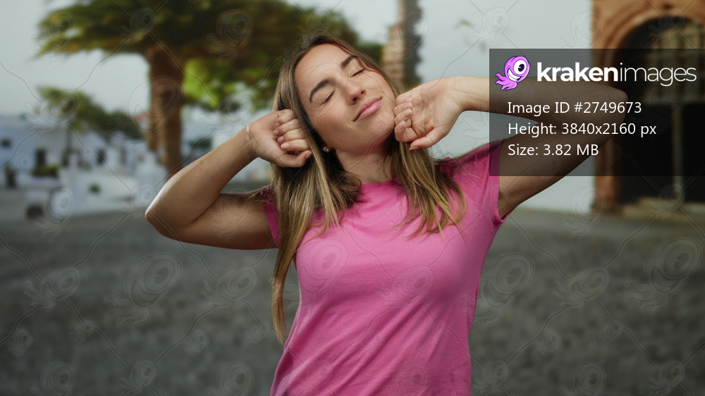 Woman in pink shirt stretches outdoors on a street, expressing morning energy and relaxation amid a vibrant urban backdrop, embodying refreshing positivity and youthful spirit. - Kraken Images
