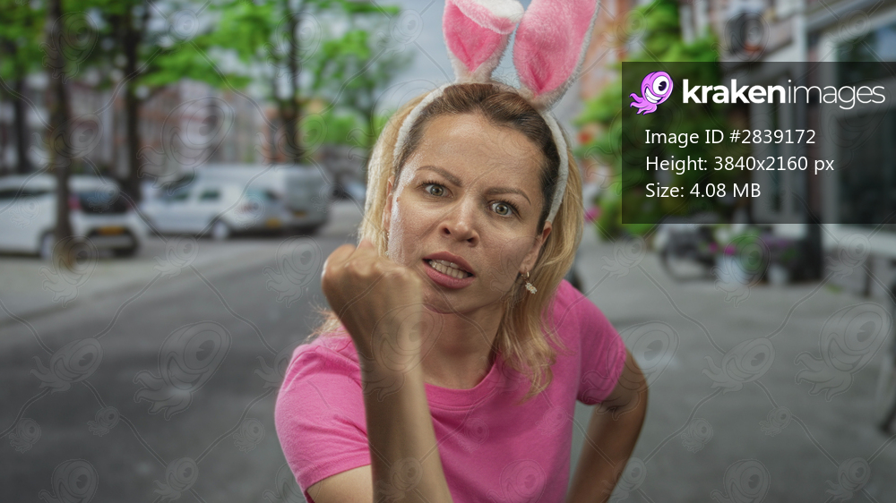 Woman in pink shirt wearing bunny ears shakes fist at camera on quiet urban residential street; defiance.
