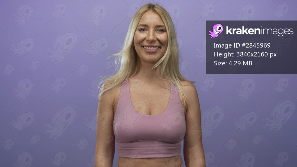 Woman in pink sports bra shows blonde hair, reveals her shoulders and smiles with closed eyes in studio; serenity balance wellness mindfulness.