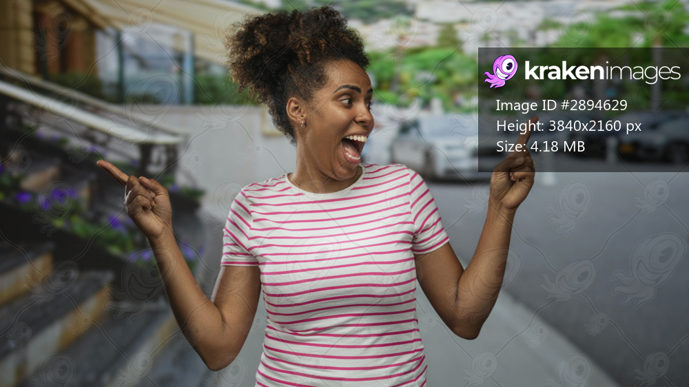 Woman in pink striped shirt pointing both index fingers upward on city street near parked cars and smiling broadly; happiness playfulness.