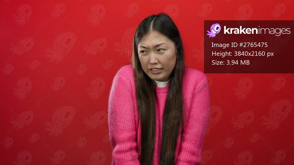 Woman in pink sweater against red background shows various expressions, suggesting emotions like cold and contemplation.