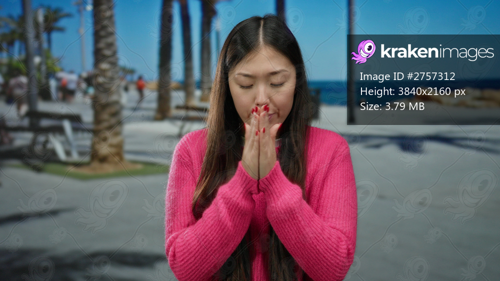 Woman in pink sweater at seaside promenade feeling cold with eyes closed by the beach in an outdoor setting showcasing vibrant colors and serene environment. - Kraken Images