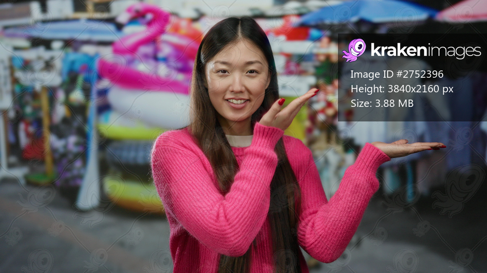 Woman in pink sweater displays hand at outdoor market with colorful stalls, showcasing vibrant street shopping experience in busy chinese marketplace.