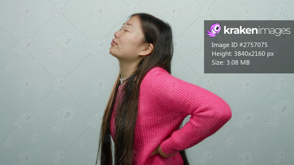 Woman in pink sweater experiencing back pain against white background showing discomfort and fatigue in isolated setting highlighting health and posture issues - Kraken Images