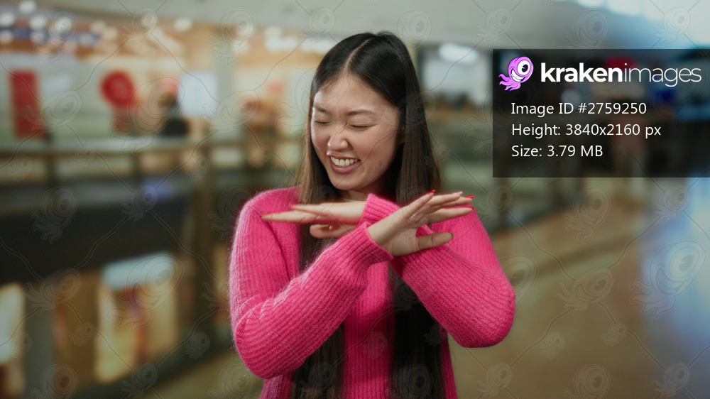 Woman in pink sweater gestures happily inside a bustling mall, showcasing asian beauty and charm in a modern shopping center setting.