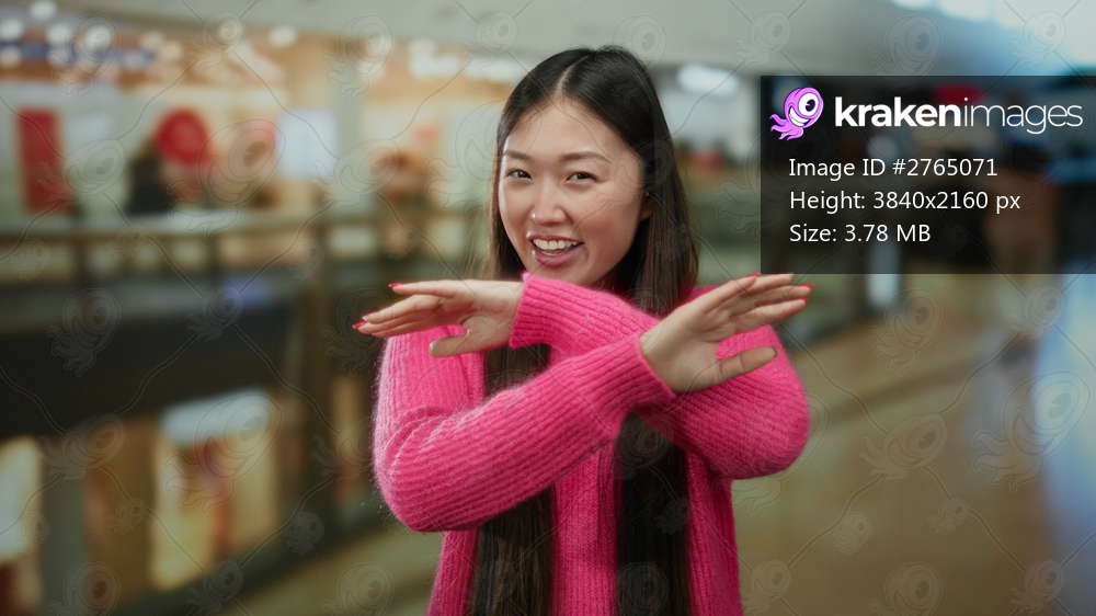 Woman in pink sweater gestures happily inside a bustling mall, showcasing asian beauty and charm in a modern shopping center setting.