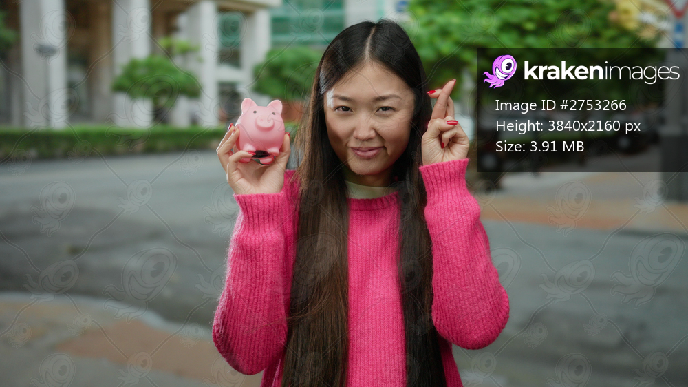 Woman in pink sweater holding piggy bank and crossing fingers on city street, symbolizing savings and luck.