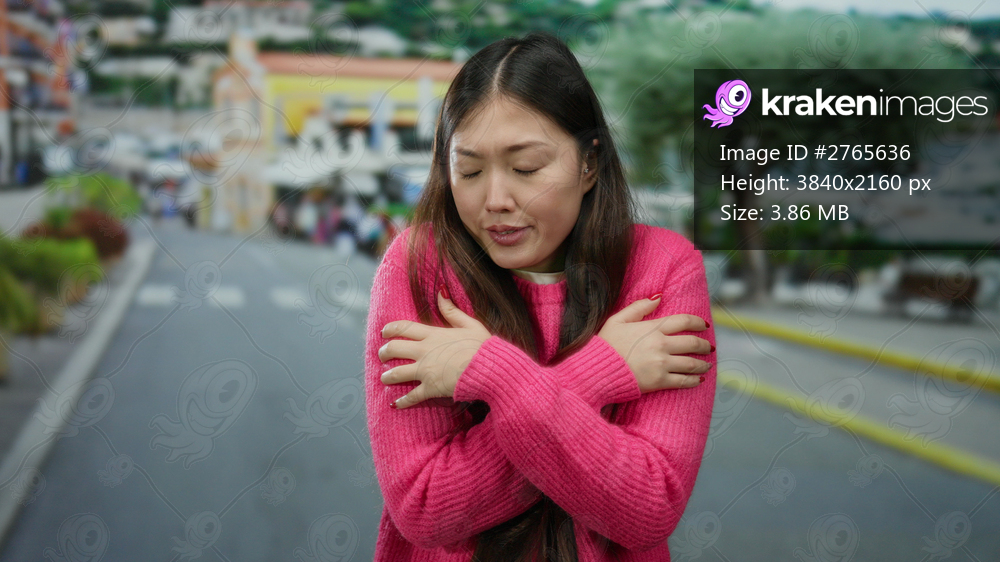 Woman in pink sweater in urban street setting with arms crossed appearing cold with blurred cityscape background.