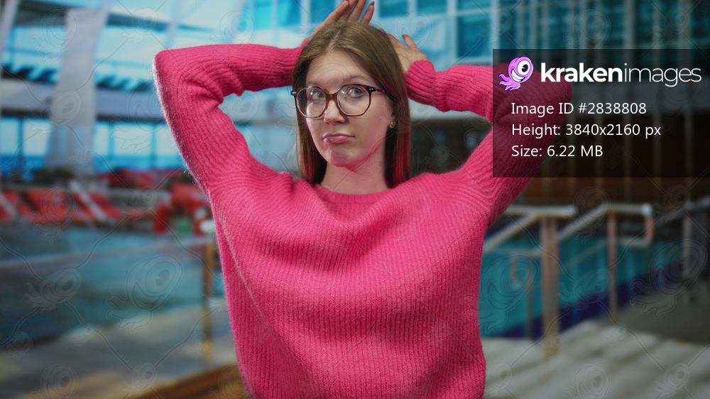 Woman in pink sweater raises arms above head, touches glasses and tilts head in building; playfulness.
