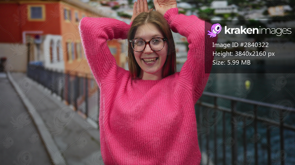 Woman in pink sweater stands hands on hips at seaside promenade railing overlooking water; confidence.