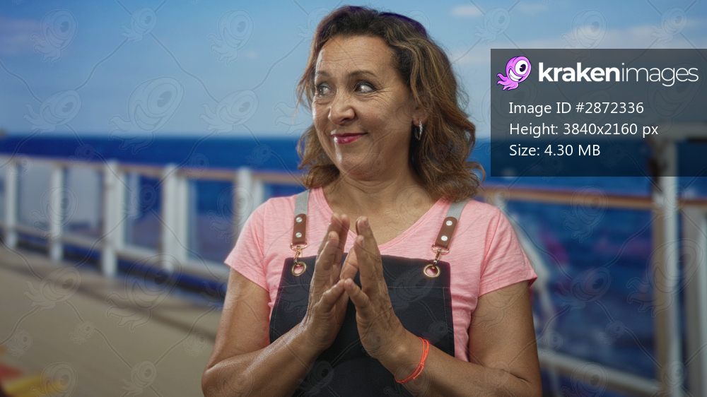 Woman in pink t shirt and apron smiles at camera while standing by ship railing on studio cruise deck; serenity.