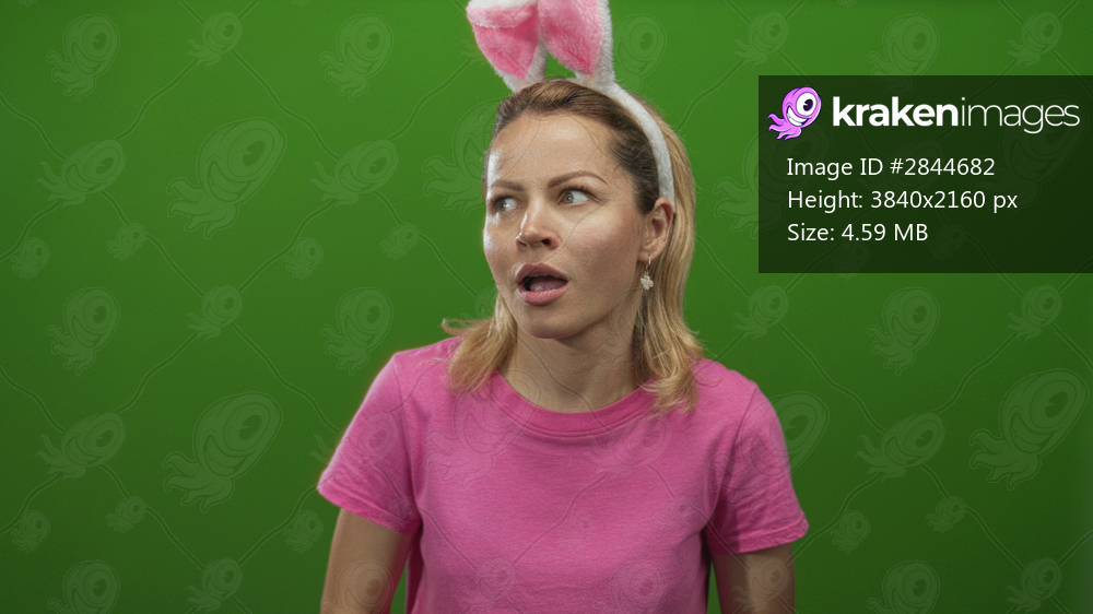 Woman in pink t shirt and bunny ear headband cups her hand to her ear with open mouth in a green studio; curiosity.