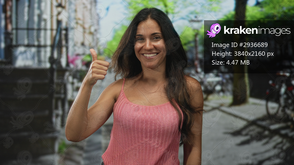 Woman in pink tank top showing bare shoulder giving thumbs up on a city street with bicycles and trees in the outdoors; confidence.