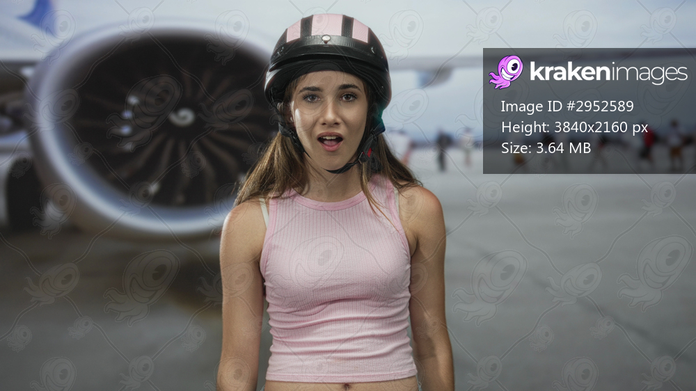 Woman in pink tank top wearing helmet, mouth open showing navel at airport tarmac; adventure surprise.