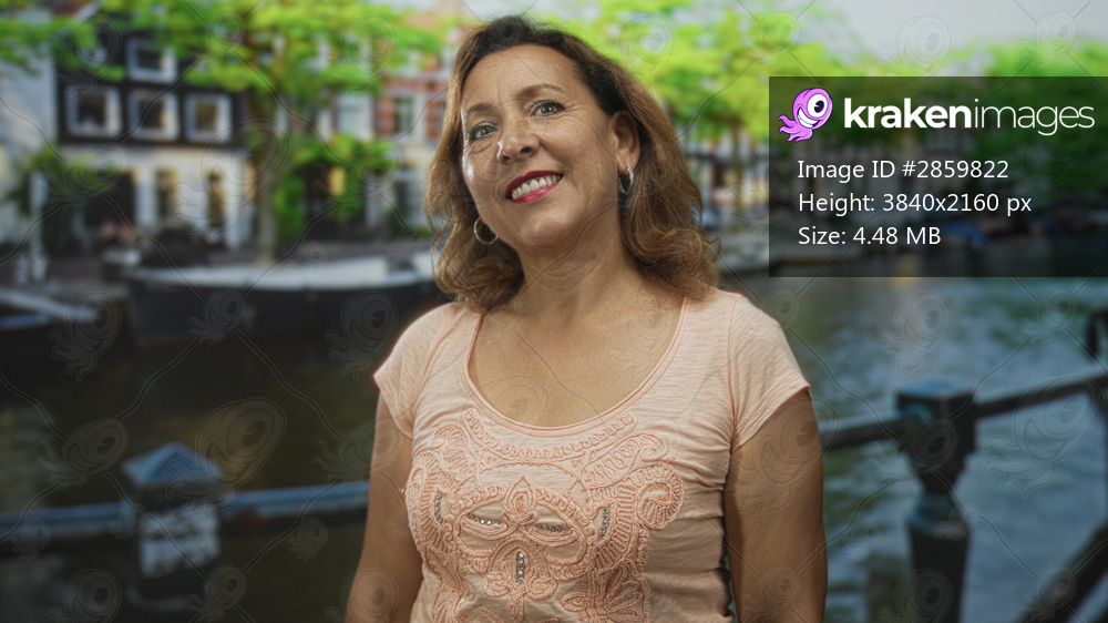 Woman in pink top forms heart shape with hands by canal on street with historic buildings behind; love bond.