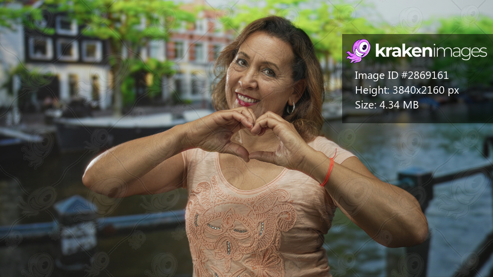 Woman in pink top forms heart shape with hands by canal on street with historic buildings behind; love bond.