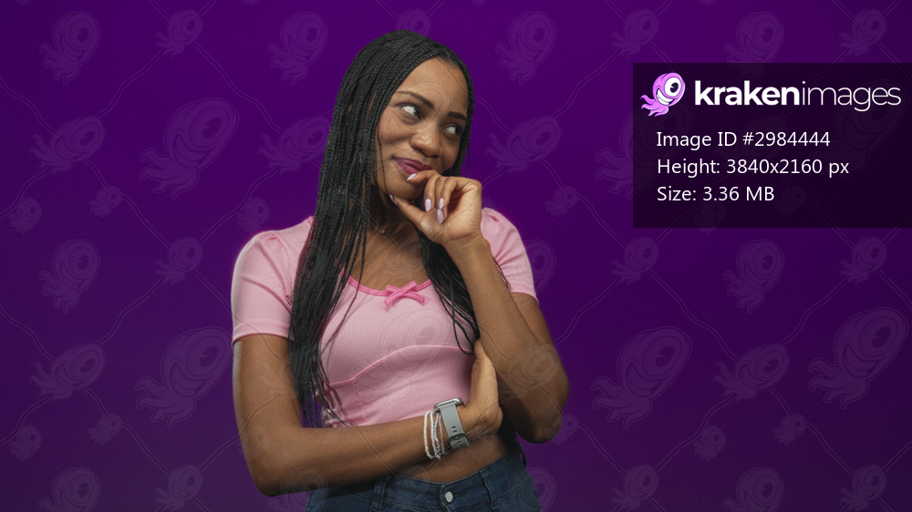 Woman in pink top with hand to chin and crossed arms in studio, braided hair, subtle smile, bracelets and smartwatch visible; thoughtful curiosity quiet confidence. - Kraken Images