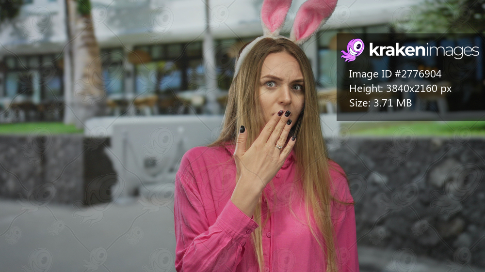 Woman in pink wearing rabbit ears covers mouth on a city street, blending easter festivity with casual outdoor ambiance, capturing a playful, whimsical urban moment. - Kraken Images