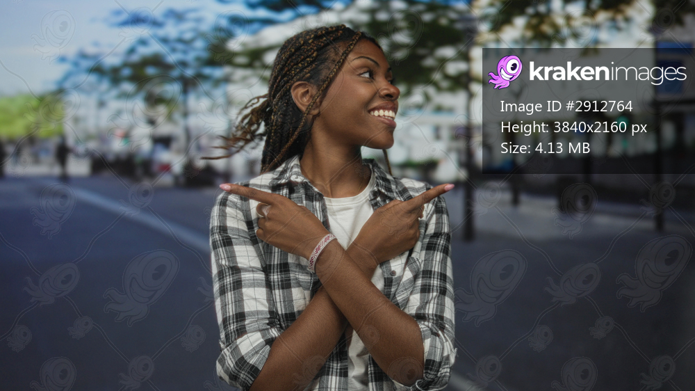Woman in plaid shirt with braids points both index fingers outward on a city street while smiling and crossing arms; joyful confidence.