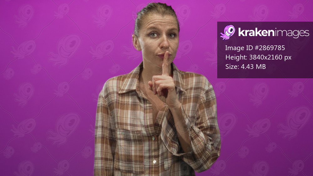 Woman in plaid shirt holding finger to lips for silence in studio with magenta backdrop; silence secrecy.