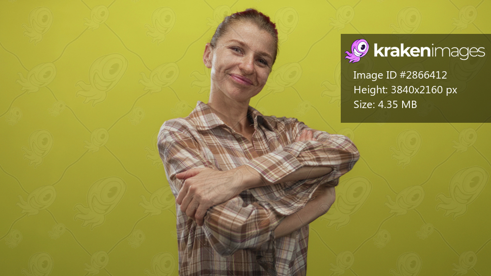Woman in plaid shirt smiling with arms crossed in yellow studio under soft lighting, hair in bun with hairclip; serenity confidence warmth.