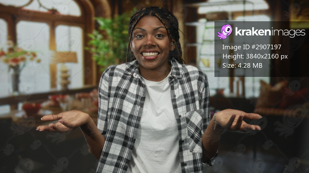 Woman in plaid shirt and white tshirt shrugs with hands up in a room, braids and nosepiercing visible, palms open and gaze upward; confusion.