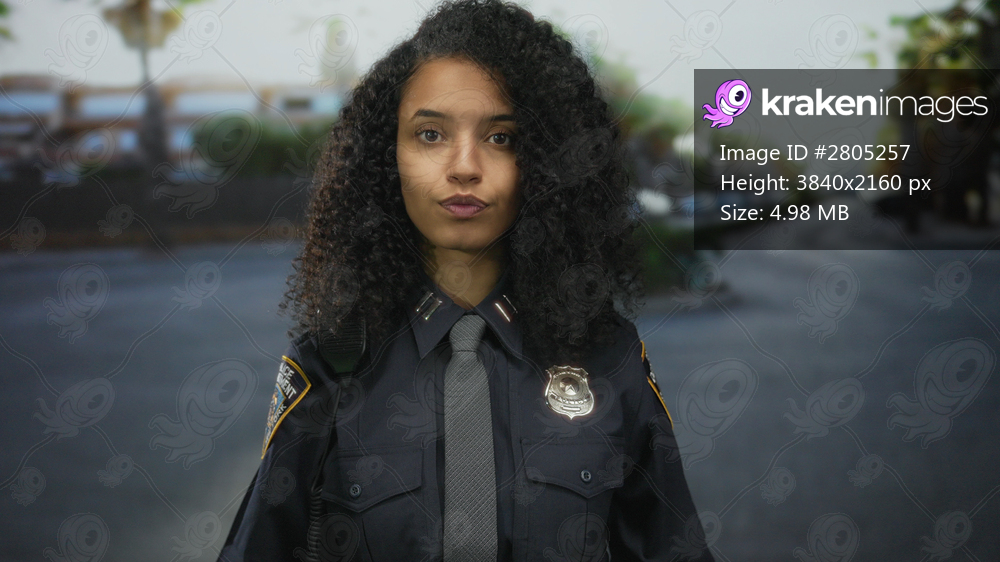 Woman in police uniform displaying emotions on a street with blurred background, illustrating outdoor urban setting.