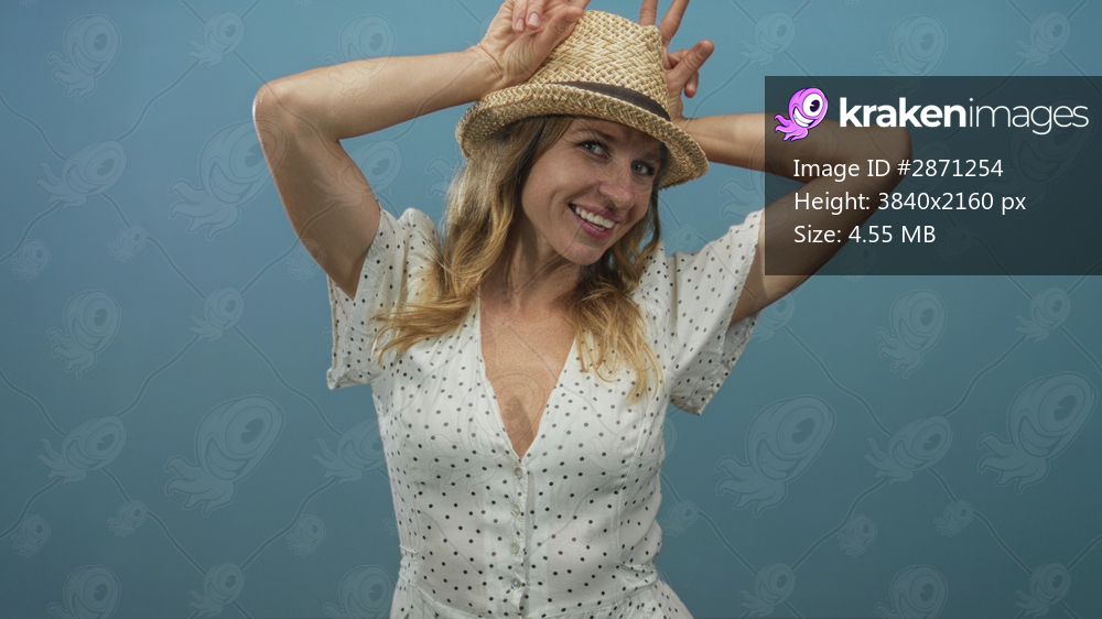 Woman in polka dot dress with straw hat making peace sign and holding hat over head in blue studio; playful summer fun.