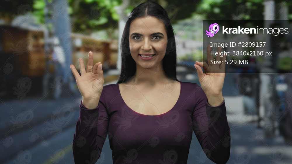 Woman in purple practicing mindfulness on a sunny street, making gestures with her hands, surrounded by trees and urban landscape, conveying peace in an outdoor setting. - Kraken Images