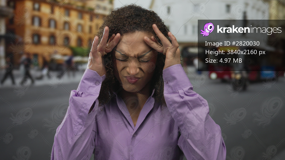 Woman in purple shirt pressing temples on street with red bus passing in front of historic building; stress.