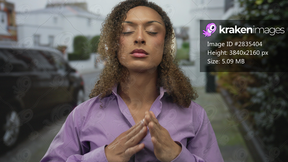 Woman in purple shirt shows ok sign with hands on a sunny city street flanked by white houses and green hedges; empowerment.