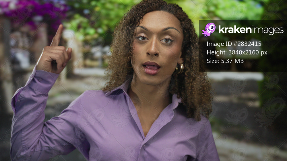Woman in purple shirt with wide eyes pointing finger to sky on green street with trees; curiosity surprise.