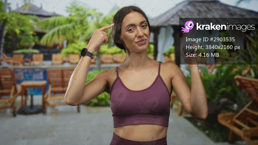 Woman in purple sports bra points finger to temple while holding dumbbell by resort building pool deck; fitness confidence.