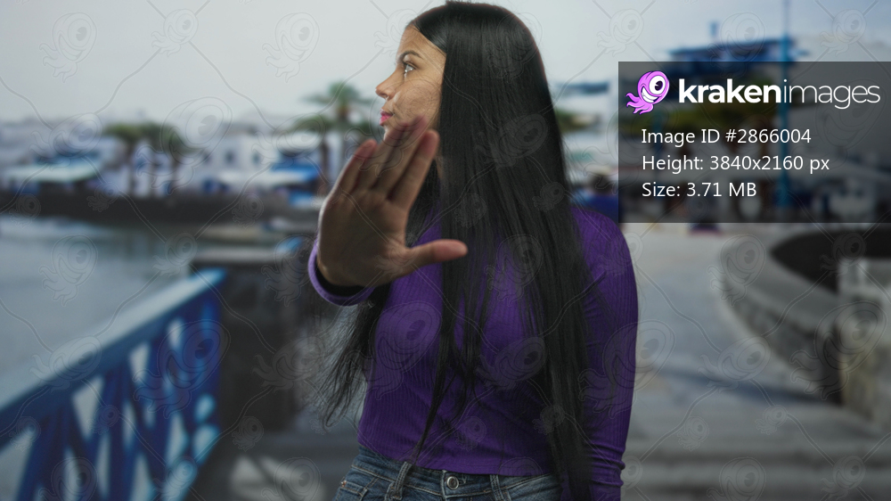 Woman in purple sweater and jeans extends hand palm forward on street by seaside railing; boundary defiance.