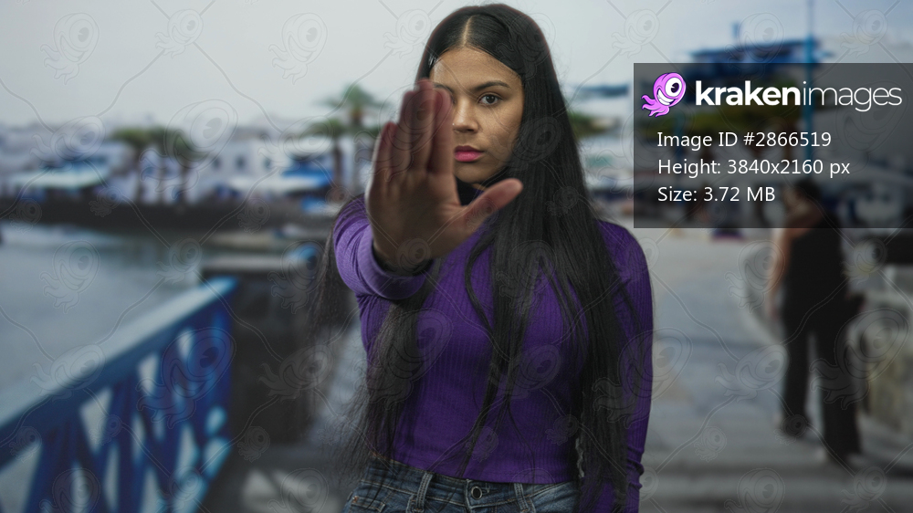 Woman in purple sweater and jeans extends hand palm forward on street by seaside railing; boundary defiance.