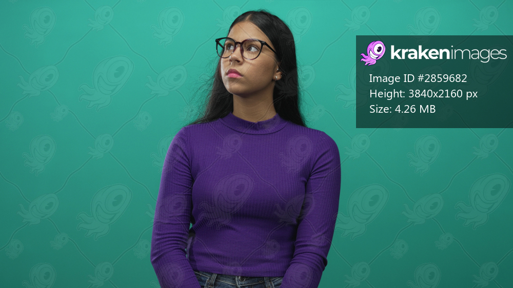 Woman in purple sweater wearing glasses rubs eyes with serious expression in studio with green wall; fatigue weariness exhaustion drowsiness.