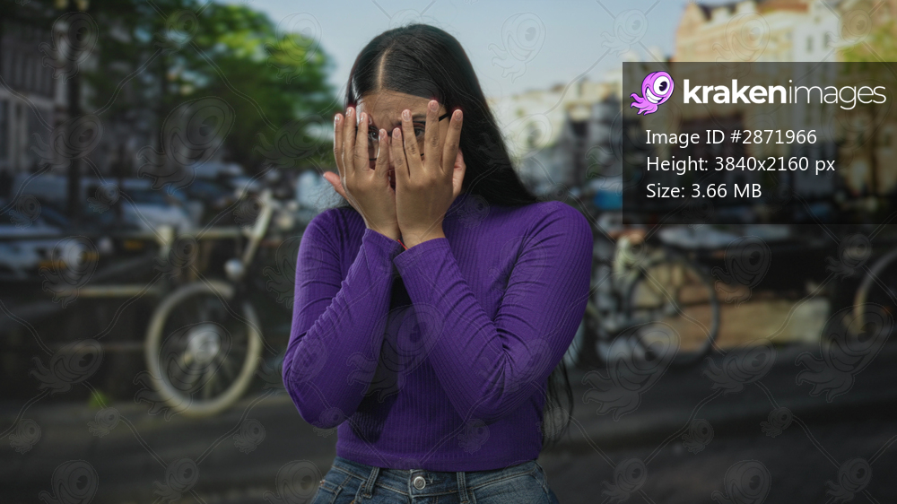 Woman in purple top covers face with hands by canal street outdoors during daylight; inner embarrassment.