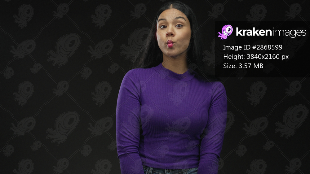 Woman in purple top with long black hair pucker lips and tilt head against black studio wall; playful mood.
