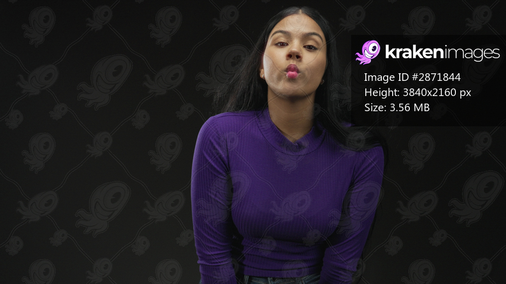 Woman in purple top with long black hair pucker lips and tilt head against black studio wall; playful mood.